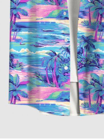 Plus Size Coconut Tree Colorful Sea Waves Print Buttons Pocket Hawaii Shirt For Men - Blue - L