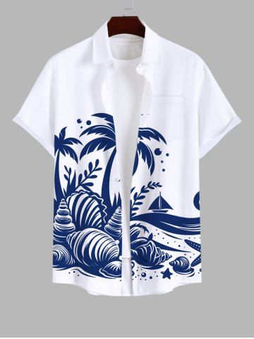 Short Sleeves Shirts > Plus Size Coconut Tree Conch Sailboat Sea Print Buttons Pocket Hawaii Shirt For Men