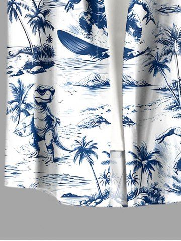 Plus Size Coconut Tree Dinosaur Sea Waves Print Buttons Pocket Hawaii Shirt For Men - Blue - Xl