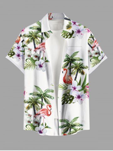 Plus Size Coconut Tree Flamingo Flowers Leaf Print Buttons Pocket Hawaii Shirt For Men - White - 2xl