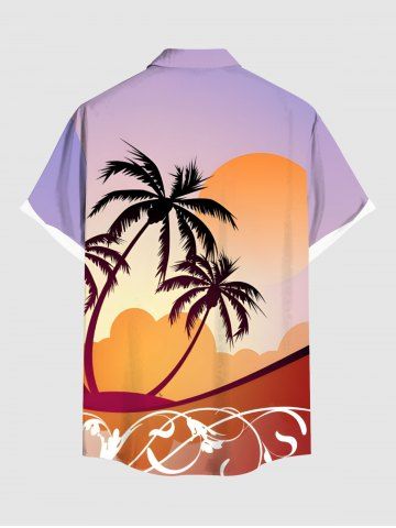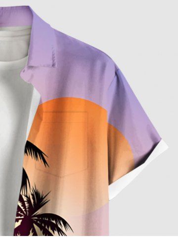 Plus Size Coconut Tree Floral Sun Print Buttons Pocket Hawaii Shirt For Men - Light Purple - L