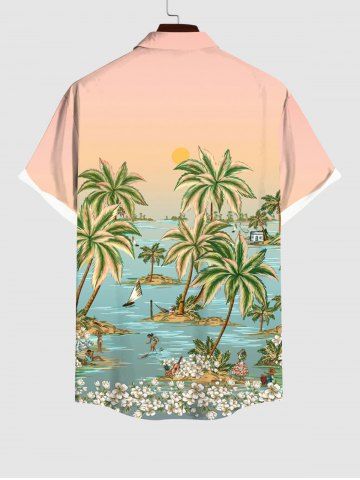 Short Sleeves Shirts > Plus Size Coconut Tree Flowers Boat Seascape Print Buttons Pocket Hawaii Shirt For Men