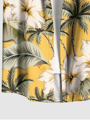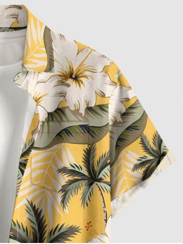 Plus Size Coconut Tree Flowers Leaf Tropical Print Buttons Pocket Hawaii Shirt For Men - Yellow - S