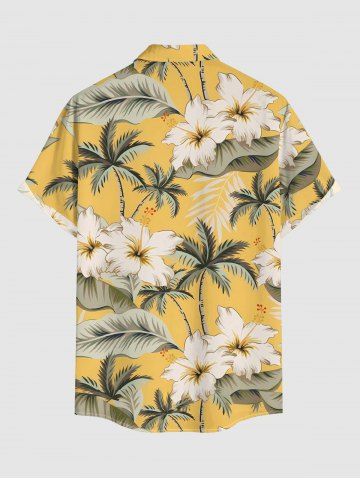 Plus Size Coconut Tree Flowers Leaf Tropical Print Buttons Pocket Hawaii Shirt For Men - Yellow - 6xl