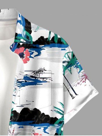 Plus Size Coconut Tree Flowers Mountain Print Buttons Pocket Hawaii Shirt For Men - White - M