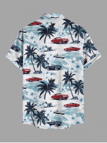 Plus Size Coconut Tree Flowers Sea Waves Car Print Buttons Pocket Hawaii Shirt For Men - White - S
