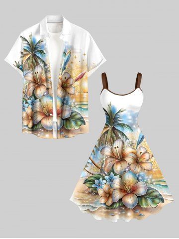 Short Sleeves Shirts > Plus Size Coconut Tree Glitter Tropical Leaf Hibiscus Flower Sea Print Hawaii Button Pocket Shirt For Men