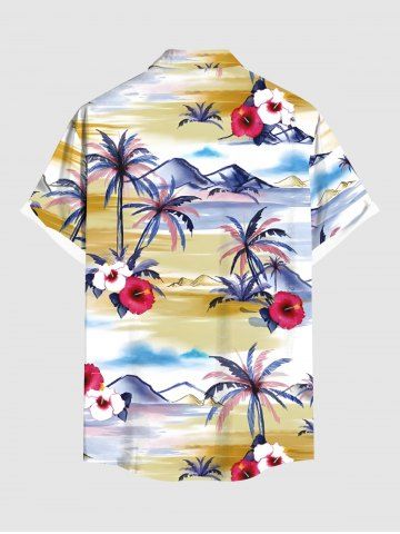 Plus Size Coconut Tree Hibiscus Floral Sea Mountain Print Hawaii Buttons Pocket Shirt For Men - Yellow - M