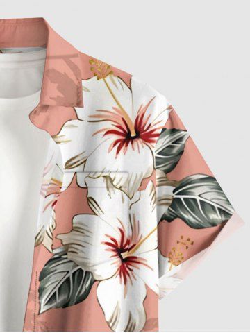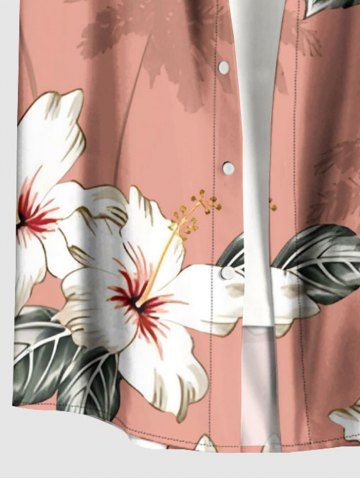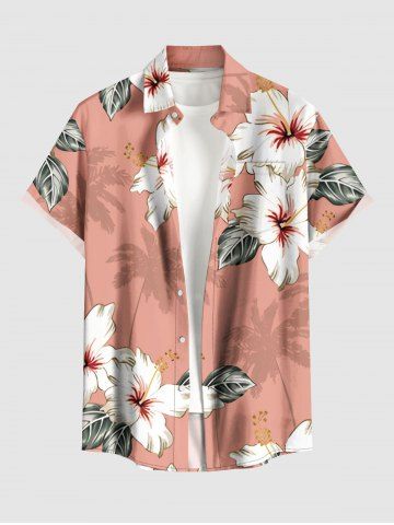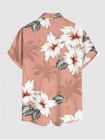Plus Size Coconut Tree Hibiscus Flower Leaf Print Hawaii Button Pocket Shirt For Men - Light Coral - 2xl
