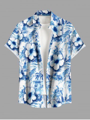 Plus Size Coconut Tree Hibiscus Flower Print Buttons Pocket Hawaii Shirt For Men - Light Blue - S