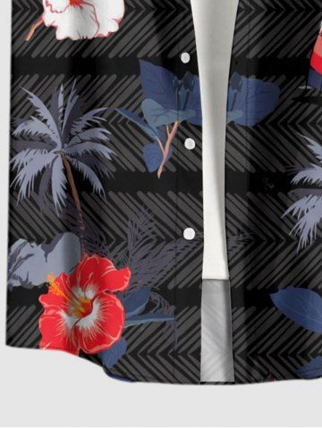 Plus Size Coconut Tree Hibiscus Flower Print Buttons Pocket Hawaii Shirt For Men - Black - Xl