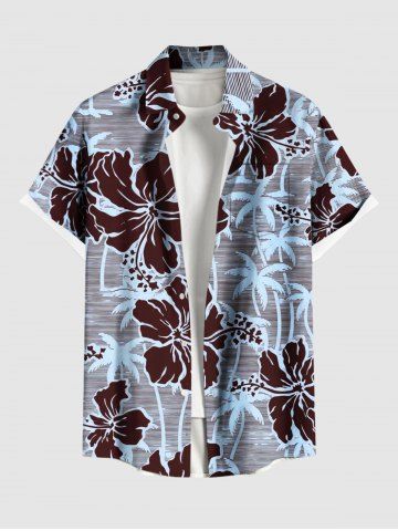 Short Sleeves Shirts > Plus Size Coconut Tree Hibiscus Flower Print Hawaii Button Pocket Shirt For Men