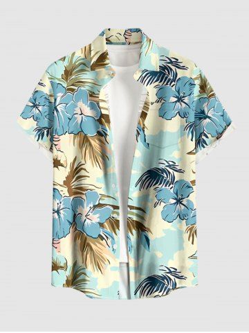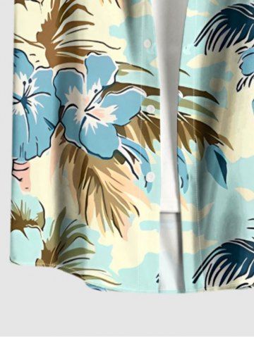 Plus Size Coconut Tree Hibiscus Flower Print Hawaii Button Pocket Shirt For Men - Light Blue - M