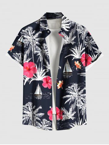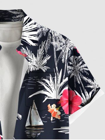Plus Size Coconut Tree Hibiscus Flower Sea Sailboat Print Hawaii Button Pocket Shirt For Men - Black - 3xl
