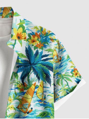 Plus Size Coconut Tree Hibiscus Flower Sea Surfer Print Hawaii Button Pocket Shirt For Men - Green - S