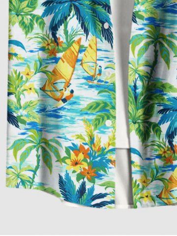 Plus Size Coconut Tree Hibiscus Flower Sea Surfer Print Hawaii Button Pocket Shirt For Men - Green - 3xl