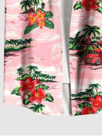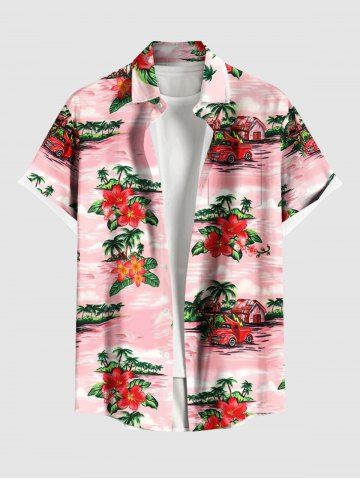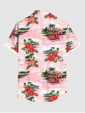 Plus Size Coconut Tree Hibiscus Flowers Car Print Buttons Pocket Hawaii Shirt For Men - Light Pink - 6xl