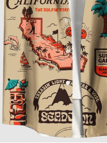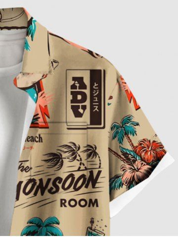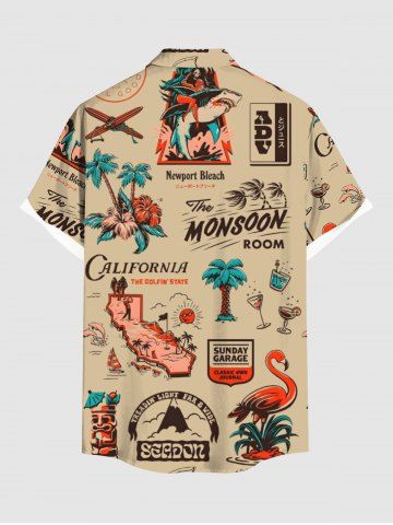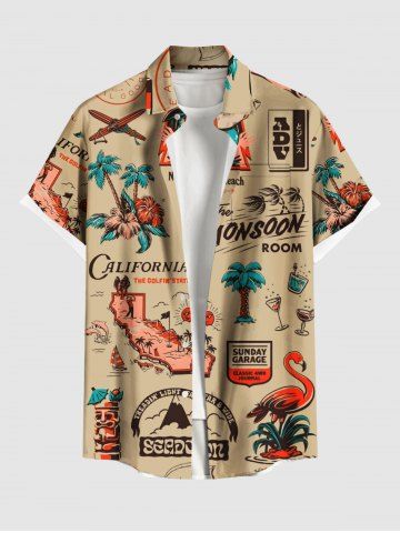 Plus Size Coconut Tree Hibiscus Flowers Flamingo Print Buttons Pocket Hawaii Shirt For Men - Light Coffee - 4xl