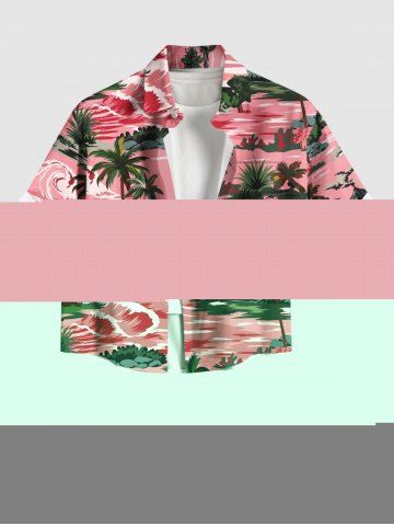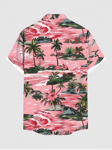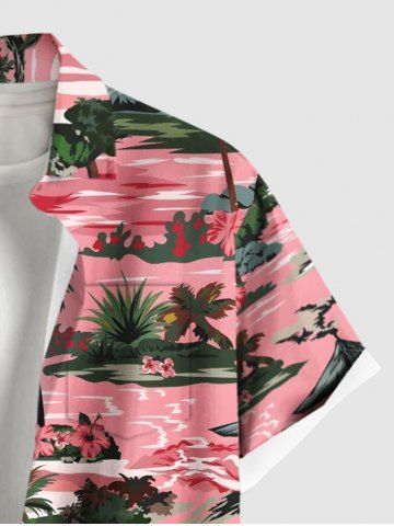Plus Size Coconut Tree Hibiscus Flowers Sea Waves Print Buttons Pocket Hawaii Shirt For Men - Light Pink - S