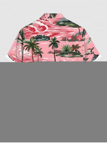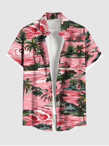 Plus Size Coconut Tree Hibiscus Flowers Sea Waves Print Buttons Pocket Hawaii Shirt For Men - Light Pink - M