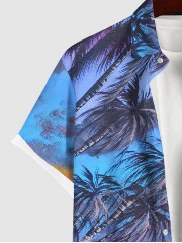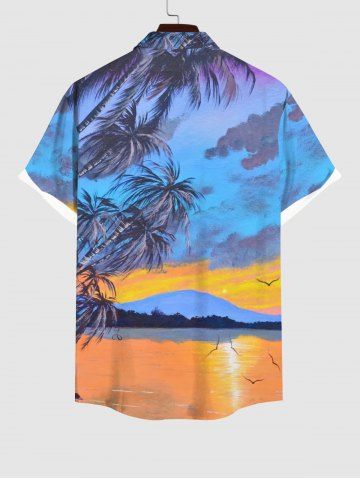 Plus Size Coconut Tree Mountain Bird Sunset Color Sky Print Buttons Pocket Hawaii Shirt For Men - Blue - Xl