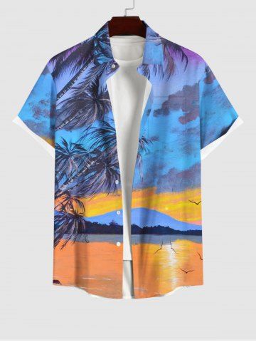 Plus Size Coconut Tree Mountain Bird Sunset Color Sky Print Buttons Pocket Hawaii Shirt For Men - Blue - 4xl