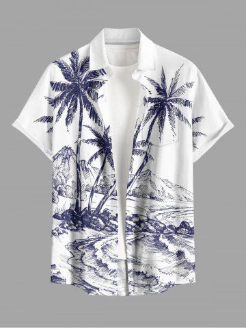 Plus Size Coconut Tree Mountain Seascape Print Buttons Pocket Hawaii Shirt For Men - Deep Blue - 2xl