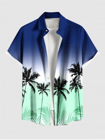 Plus Size Coconut Tree Ombre Colorblock Print Buttons Pocket Hawaii Shirt For Men - Blue - 2xl