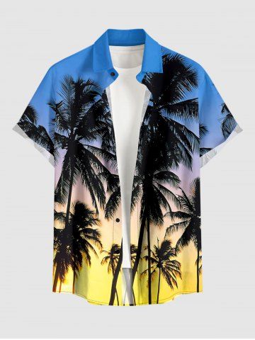 Plus Size Coconut Tree Ombre Colorblock Print Buttons Pocket Hawaii Shirt For Men - Sky Blue - Xl