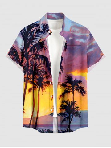 Short Sleeves Shirts > Plus Size Coconut Tree Ombre Dusk Sunset Print Hawaii Button Pocket Shirt For Men