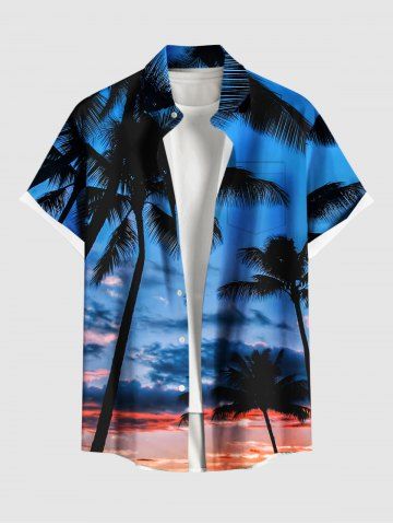 Plus Size Coconut Tree Ombre Sky Dusk Print Hawaii Button Pocket Shirt For Men - Sky Blue - 3xl