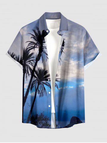 Plus Size Coconut Tree Ombre Sky Print Hawaii Button Pocket Shirt For Men - Sky Blue - M