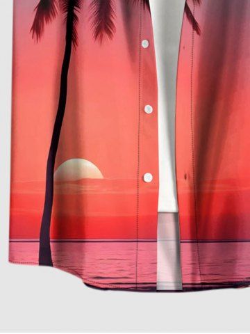 Plus Size Coconut Tree Ombre Sunset Sea Print Hawaii Button Pocket Shirt For Men - Red - L