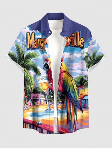 Plus Size Coconut Tree Parrot Resort Area Juice Print Hawaii Button Pocket Shirt For Men - Purple - 5xl