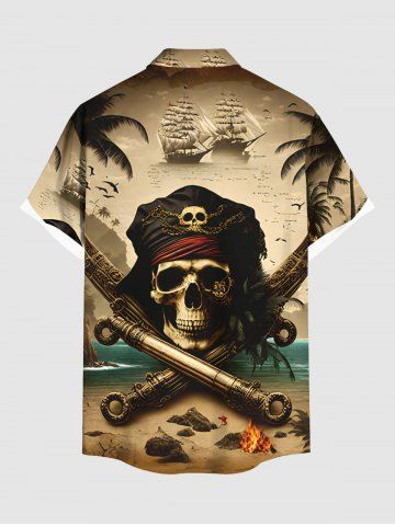 Plus Size Coconut Tree Pirate Skull Fire Flame Boat Cruise Print Buttons Pocket Hawaii Shirt For Men - Apricot - M