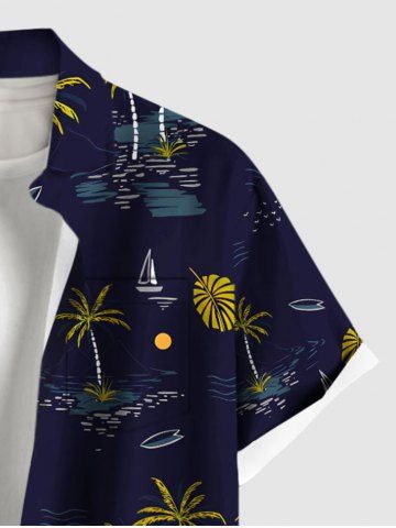 Plus Size Coconut Tree Sailboat Moon Print Buttons Pocket Hawaii Shirt For Men - Navy Blue - M