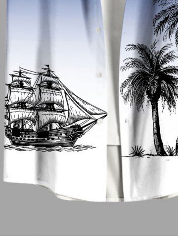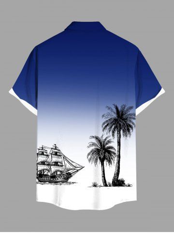 Plus Size Coconut Tree Sailboat Ombre Print Buttons Pocket Hawaii Shirt For Men - Navy Blue - M