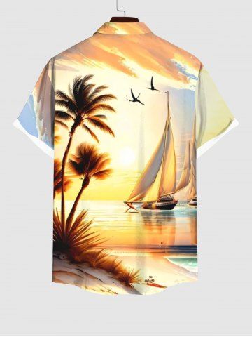 Plus Size Coconut Tree Sailboat Sea Bird Print Buttons Pocket Hawaii Shirt For Men - Multi-a - S