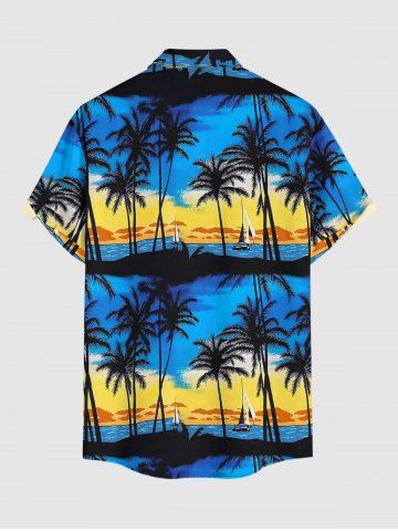 Plus Size Coconut Tree Sailboat Seascape Print Buttons Pocket Hawaii Shirt For Men - Deep Blue - L