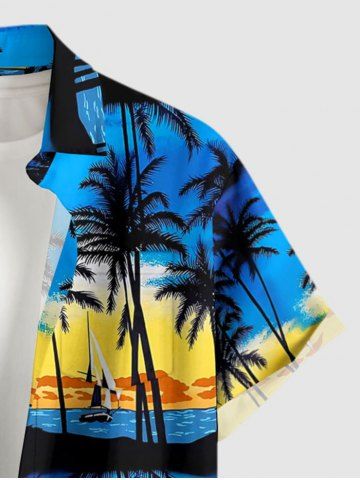 Plus Size Coconut Tree Sailboat Seascape Print Buttons Pocket Hawaii Shirt For Men - Deep Blue - 4xl