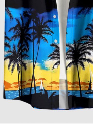 Plus Size Coconut Tree Sailboat Seascape Print Buttons Pocket Hawaii Shirt For Men - Deep Blue - 5xl