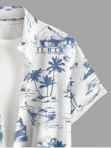 Plus Size Coconut Tree Sailboat Stone Print Buttons Pocket Hawaii Shirt For Men - White - 2xl