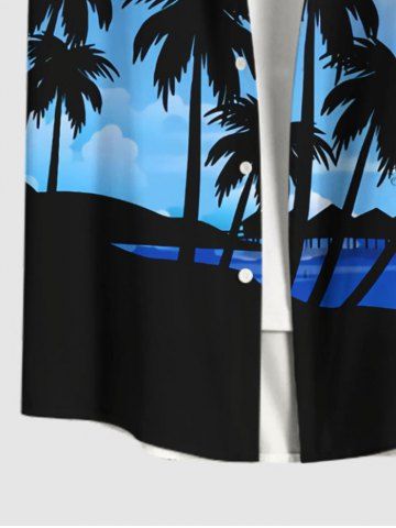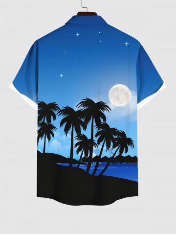 Plus Size Coconut Tree Sea Beach Ombre Galaxy Moon Print Hawaii Button Pocket Shirt For Men - Blue - L