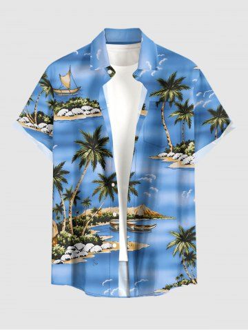 Plus Size Coconut Tree Sea Beach Print Hawaii Button Pocket Shirt For Men - Sky Blue - S