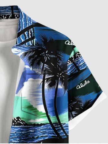 Plus Size Coconut Tree Sea Hibiscus Flower Print Hawaii Button Pocket Shirt For Men - Blue - Xl