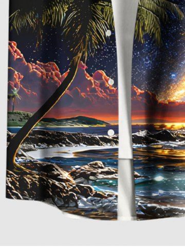 Plus Size Coconut Tree Sea Glitter Galaxy Print Hawaii Button Pocket Shirt For Men - Black - S