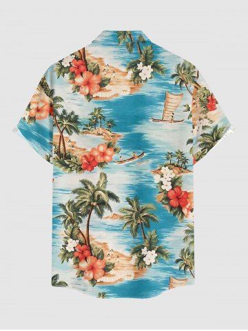 Plus Size Coconut Tree Sea Hibiscus Flower Print Hawaii Button Pocket Shirt For Men - Sky Blue - L