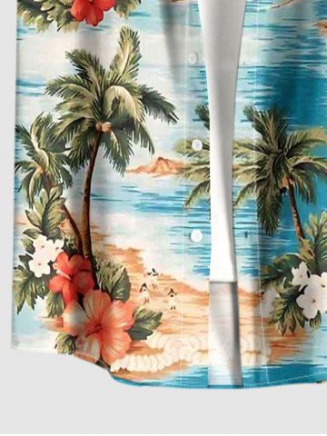 Short Sleeves Shirts > Plus Size Coconut Tree Sea Hibiscus Flower Print Hawaii Button Pocket Shirt For Men