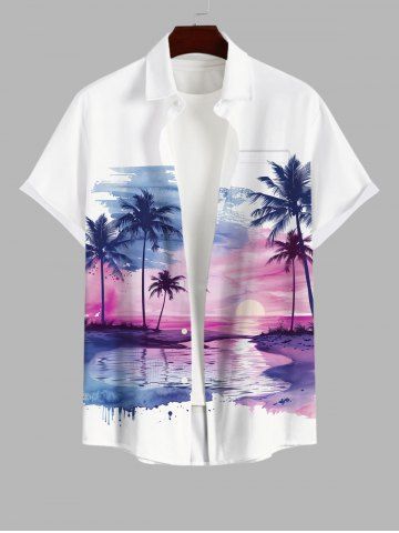 Short Sleeves Shirts > Plus Size Coconut Tree Sea Ink Painting Sun Print Hawaii Button Pocket Shirt For Men