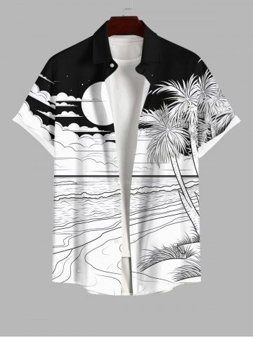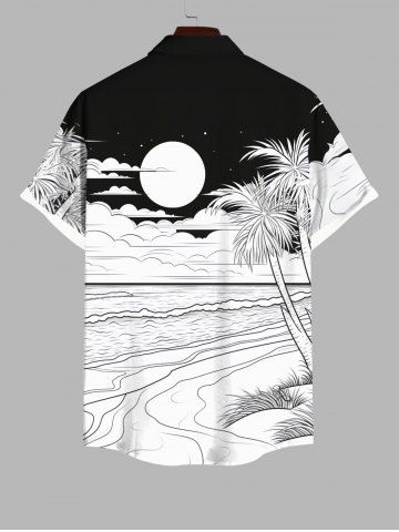 Plus Size Coconut Tree Sea Moon Cloud Print Hawaii Button Pocket Shirt For Men - Black - 3xl